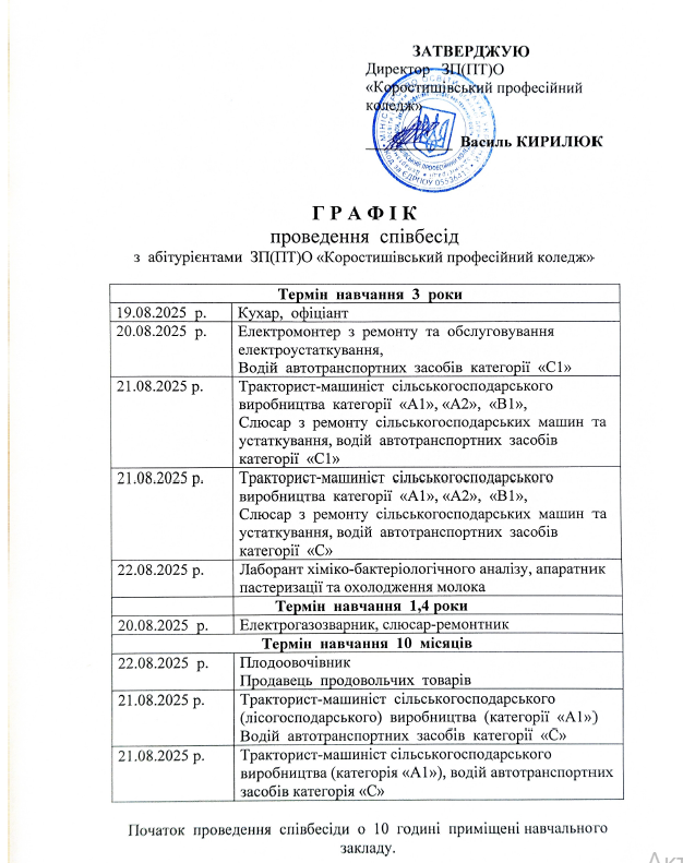 ПРАВИЛА ПРИЙОМУ до закладу професійної(професійно-технічної) освіти «Коростишівський професійний коледж» на 2025-2026 навчальний рік